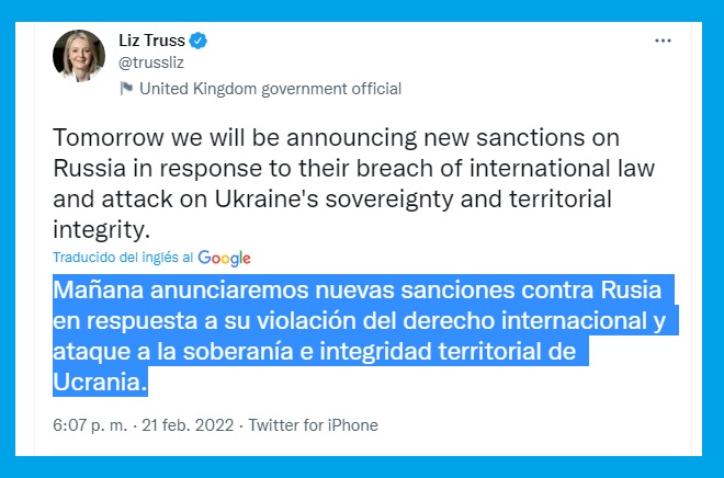 Tras la conversación, EE.UU. anunció sanciones contra las regiones separatistas reconocidas por Putin. Biden emitirá una orden ejecutiva para “prohibir nuevas inversiones, comercio y financiamiento por parte de personas estadounidenses hacia, desde o en las llamadas regiones DNR y LNR de Ucrania”, dio a conocer la secretaria de prensa de la Casa Blanca, Jen Psaki. Similar anuncio hizo la canciller británica Liz Truss: «Mañana anunciaremos nuevas sanciones contra Rusia en respuesta a su violación del derecho internacional y ataque a la soberanía e integridad territorial de Ucrania».