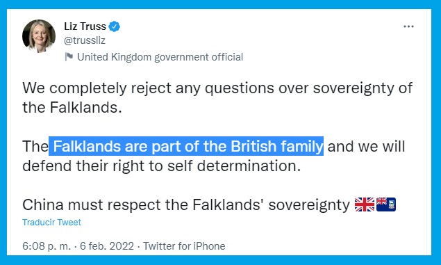 «Rechazamos por completo cualquier cuestionamiento sobre la soberanía de las Falklands. Las Falklands son parte de la familia británica y defenderemos su derecho a la autodeterminación. China debe respetar la soberanía de las Falklands», posteó la ministra Truss.
