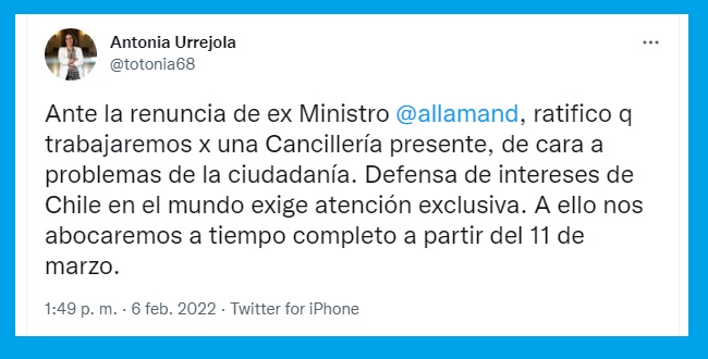 «Ante la renuncia de ex Ministro @allamand, ratifico q trabajaremos x una Cancillería presente, de cara a problemas de la ciudadanía. Defensa de intereses de Chile en el mundo exige atención exclusiva. A ello nos abocaremos a tiempo completo a partir del 11 de marzo», posteó la próxima canciller Antonia Urrejola, ante el escándalo que ha protagonizado el ahora excanciller Andrés allamand, que suma otro lugrubre episodio al proceso de fin del gobierno de Sebastían Piñera.