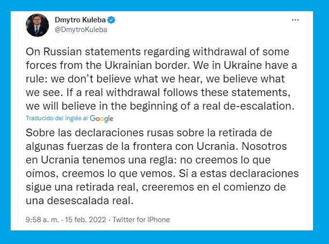«Sobre las declaraciones rusas sobre la retirada de algunas fuerzas de la frontera con Ucrania. Nosotros en Ucrania tenemos una regla: no creemos lo que oímos, creemos lo que vemos. Si a estas declaraciones sigue una retirada real, creeremos en el comienzo de una desescalada real» posteó el canciller ucraniano Dmytro Kuleba, reaccionando así al anuncio de Moscú que ha comenzado la retirada de sus tropas.