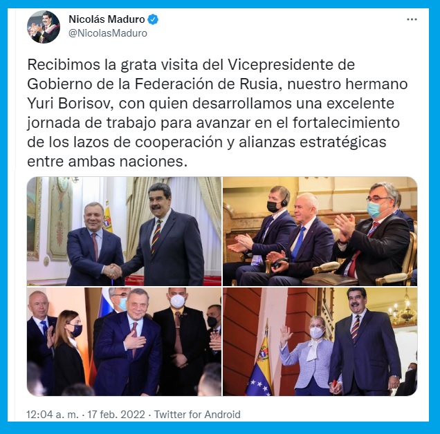 Maduro, considerado un dictadorcillo por gran parte del mundo civilizado occidental reafirmó «todo el respaldo» al presidente ruso, Vladimir Putin, en la defensa de la «paz» de Rusia, de la región y de «su pueblo». Pero este apoyo a Moscú no es novedad ya que Venezuela ha cultivado con fervor la relación con Rusia.