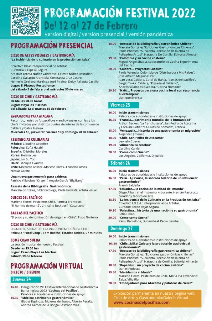 Las “Residencias Culinarias” contarán con la participación de variados cocineros y cocineras, además de agentes culinarios de naciones como México, Francia, Italia, España, Venezuela, Ecuador, Colombia, Korea, Japón, Haití, Palestina y Chile quienes a través de un especial grupo de 10 representantes, a modo de “Embajadores Gastronómicos para Atacama”, recorrerán el territorio y se vincularán tanto con lo local, destacando sus virtudes, podrán exponer sus orígenes, durante su visita por Caldera y Bahía Inglesa, los días 16, 17, 18, 19 y 20 de este mes, generando material de difusión tanto para las transmisiones digitales del evento, que serán entre los días jueves 24 y domingo 27 de febrero, antecedido por un intenso e interesante “Ciclo de Cine y Gastronomía” curado junto a Centro Arte Alameda, quienes con la colaboración del Museo de Arte Precolombino y su muestra de Cine y Video Indígena, mediante cortometrajes, largometrajes y documentales ahondarán en variadas temáticas donde la relación entre séptimo arte y alimentación abren un fuerte campo de análisis. Esta actividad se desarrollo desde el sábado 12 al martes 15 de febrero, finalizando hoy en La Playa Las Piscinas del Balneario de Bahía Inglesa a partir de las 20 horas. La entrada es liberada.