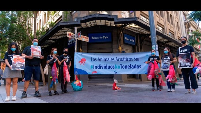 “Hay billones de animales sufriendo, múltiples ecosistemas que están siendo destruidos y una gran cantidad de comida contaminada por esta industria que termina en los platos de los chilenos. El sábado pasado fue el Día Mundial por el Fin de la Pesca, y estamos aquí porque alguien tiene que hacer rendir cuentas a esta industria”, explica María Ignacia Gálvez, Gerenta de Campañas de Sinergia Animal, una organización internacional que trabaja en los países del Sur global para ayudar a los animales en la industria alimentaria y promover una alimentación más compasiva. “Sabemos que los chilenos son personas compasivas. Esperamos que si ellos están bien informados, puedan tomar mejores decisiones acerca de los alimentos que comen”, agrega Gálvez.