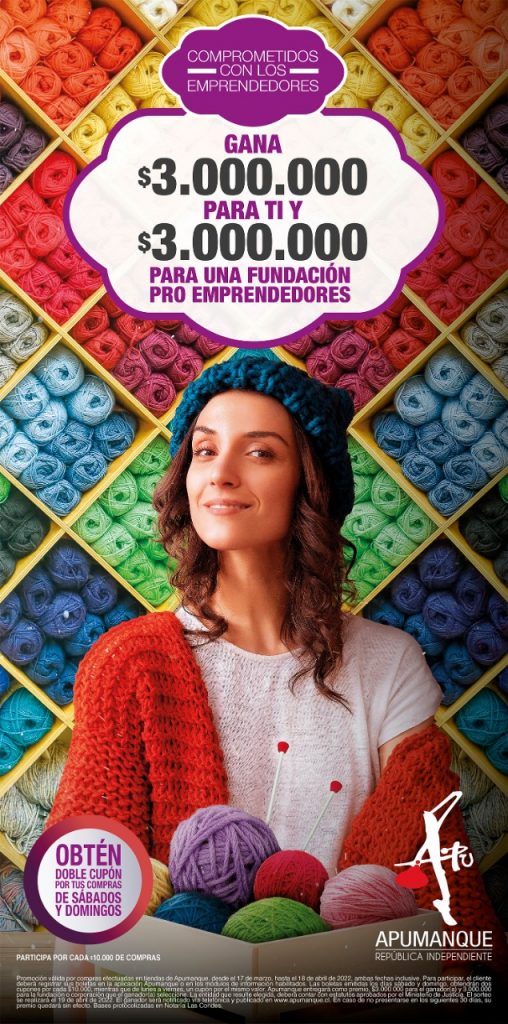 El inicio de la temporada otoño-invierno llega con una nueva promoción por parte de Apumanque, centro comercial del sector oriente de la capital, y el primero del país. Desde el 17 de marzo y hasta el 18 de abril, por cada $10.000 en compras, los participantes reciben un cupón para el sorteo de un premio de $3 millones de pesos -y dos cupones por sus compras los fines de semana-, que contará con un monto espejo el cual será donado a una organización que promueva el desarrollo de emprendedores y Pymes.