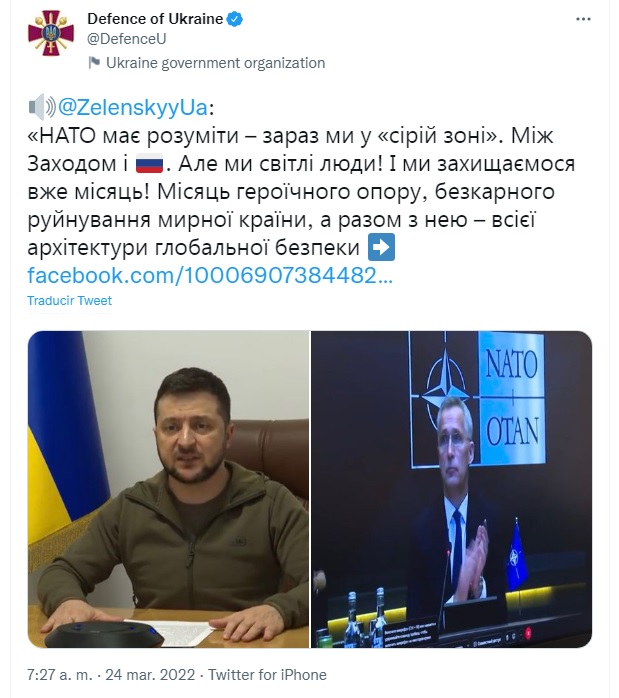 Ucrania tiene el derecho fundamental a la legítima defensa en virtud de la Carta de las Naciones Unidas. Desde 2014, hemos brindado un amplio apoyo a la capacidad de Ucrania para ejercer ese derecho. Hemos capacitado a las fuerzas armadas de Ucrania, fortaleciendo sus capacidades y capacidades militares y mejorando su resiliencia. Los aliados de la OTAN han intensificado su apoyo y continuarán brindando más apoyo político y práctico a Ucrania mientras continúa defendiéndose. Los aliados de la OTAN también continuarán brindando asistencia en áreas tales como ciberseguridad y protección contra amenazas de naturaleza química, biológica, radiológica y nuclear. Los aliados de la OTAN también brindan un amplio apoyo humanitario y albergan a millones de refugiados. Los Ministros de Relaciones Exteriores discutirán más a fondo nuestro apoyo a Ucrania cuando se reúnan en abril.