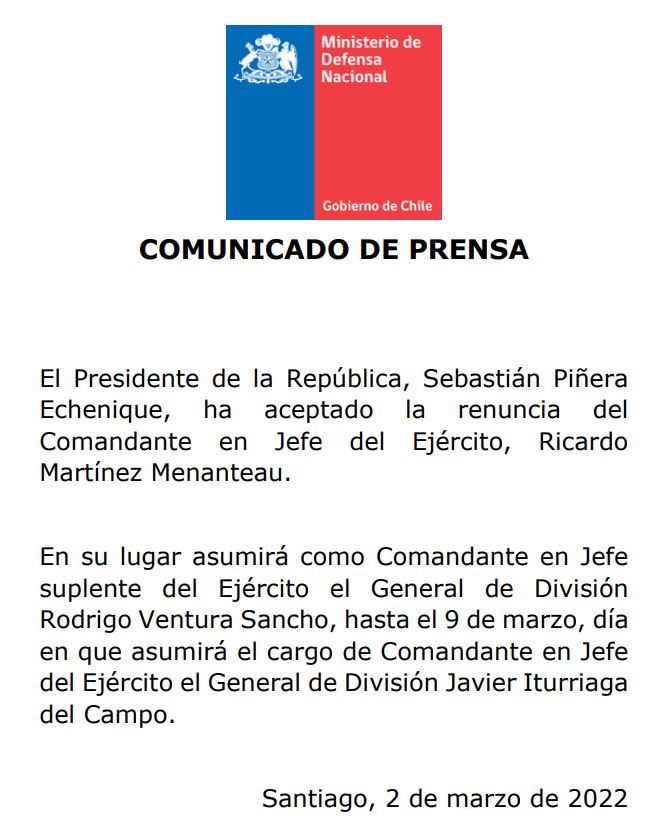 Mediante un comunicado del Ministerio de Defensa, el Gobierno anunció la designación del general de División Rodrigo Ventura Sancho como Comandante en Jefe Suplente del Ejército, tras hacerse efectiva la renuncia presentada esta mañana por el anterior titular del cargo, Ricardo Martínez Menanteau.