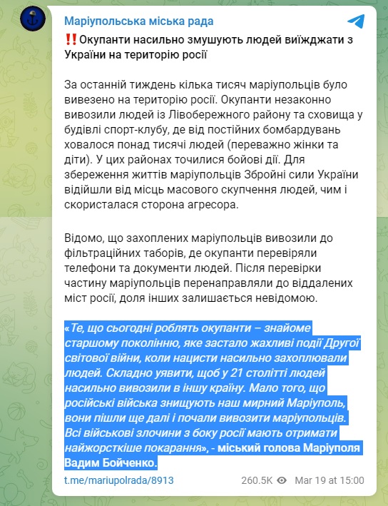 «Los ocupantes obligan a la gente a abandonar Ucrania por la fuerza para ir a Rusia. Durante la semana pasada, varios miles de residentes de Mariupol fueron deportados a Rusia. Los ocupantes sacaron ilegalmente a la gente del distrito de la Margen Izquierda y se refugiaron en el edificio del club deportivo, donde más de mil personas (en su mayoría mujeres y niños) se escondían de los constantes bombardeos. Los combates tuvieron lugar en estas áreas. Para salvar la vida de los residentes de Mariupol, las Fuerzas Armadas de Ucrania se retiraron de los lugares concurridos, que fue utilizado por el agresor«