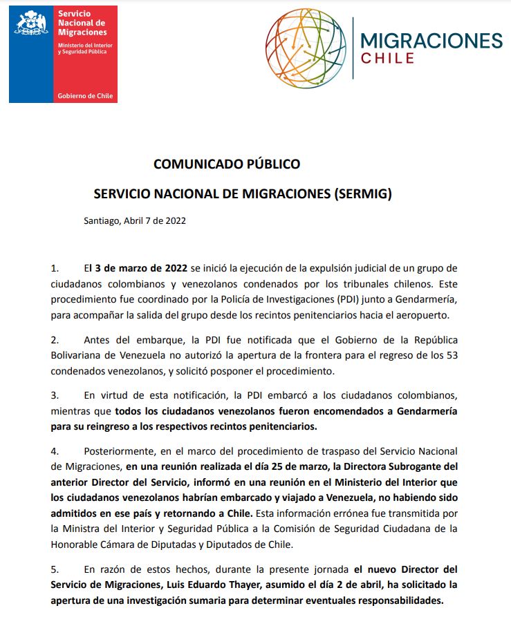 «En razón de estos hechos, durante la presente jornada el nuevo director del Servicio de Migraciones, Luis Eduardo Thayer, asumido el día 2 de abril, ha solicitado la apertura de una investigación sumaria para determinar eventuales responsabilidades», concluyó el comunicado.