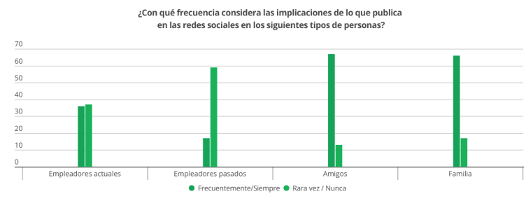 En cuanto a las consecuencias que podrían traer las publicaciones, cabe destacar que los usuarios en la región prestan más atención a las consecuencias personales que a las profesionales, pues el 29% contempla las implicaciones que generaría su contenido publicado hacia sus empleadores, mientras que el 60&% siempre o casi siempre le presta atención a los efectos que traería en su grupo de amigos.