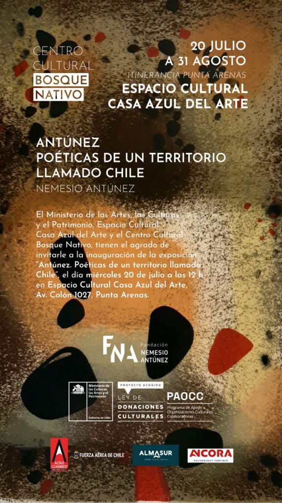 Esta actividad en Centro Cultural Bosque Nativo cuenta con el financiamiento del Ministerio de las Culturas, las Artes y el Patrimonio a través de su Programa de Apoyo a Organizaciones Culturales Colaboradoras, además del apoyo de Inmobiliaria Altas Cumbres, Hotel Almazur y Ancora Technology Partners, que se sumaron a través de la Ley de Donaciones Culturales para hacer posible esta imperdible actividad cultural, junto a la Fuerza Aérea de Chile. “Es muy importante que se generen estos espacios en Punta Arenas y nos enorgullece poder colaborar en acercar esta exposición de gran nivel a toda la comunidad de manera gratuita y poder conocer en persona la gran obra de Nemesio Antúnez”, sostiene Enrique Loeser, gerente Comercial de Inmobiliaria Altas Cumbres.