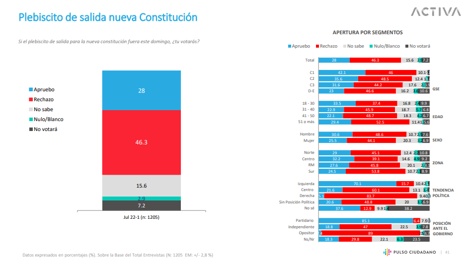 De esta forma, el estudio muestra que un 46,3% de la población votará “Rechazo” frente al borrador de la Nueva Carta Magna, si las elecciones fueran este domingo, mientras que un 28% votará “Apruebo”, un 15,6% está indeciso, un 2,9% votará nulo/blanco y un 7,2% no votará.
