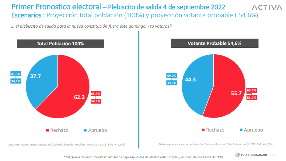 Además, la encuesta proyecta que entre un 50,9% y 58,3% del padrón electoral votaría en el plebiscito del 4 de septiembre, mientras que la estimación puntual es de un 54,6% lo que implicaría 8.231.836 votantes.