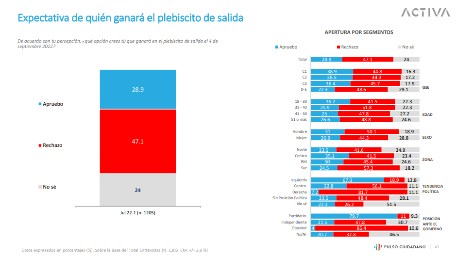En cuanto a expectativas de quién cree que ganará el plebiscito de salida, un 47,1% piensa que va a ganar la opción “Rechazo” ++5,5 puntos con relación a la medición pasada, un 28,9%% piensa que va a ganar la opción “Apruebo”, — 3,2 puntos con relación a la medición pasada. Además, un 24% no sabe quién ganará.