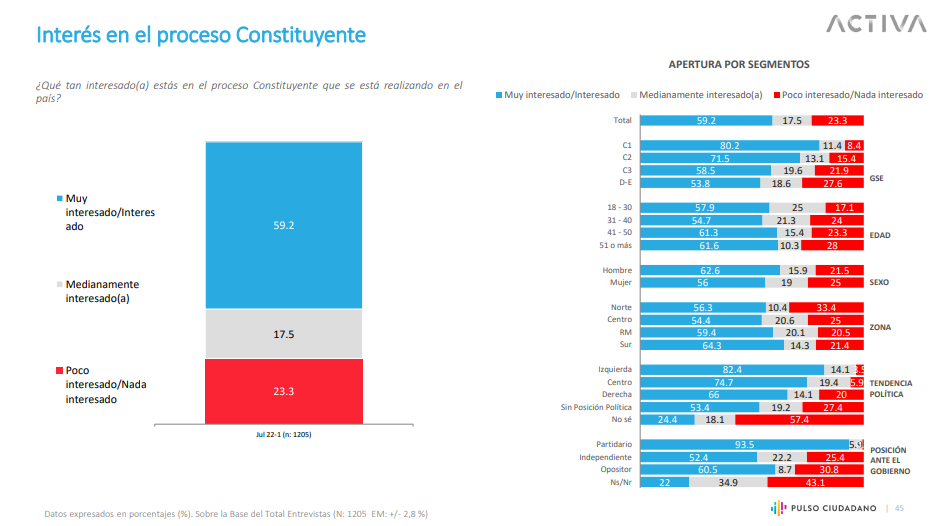 El estudio muestra que un 59,2% de la población está muy interesado/interesado en el Proceso Constituyente que está viviendo el país, un 23,3% está nada/poco interesado y un 17,5% medianamente interesado.