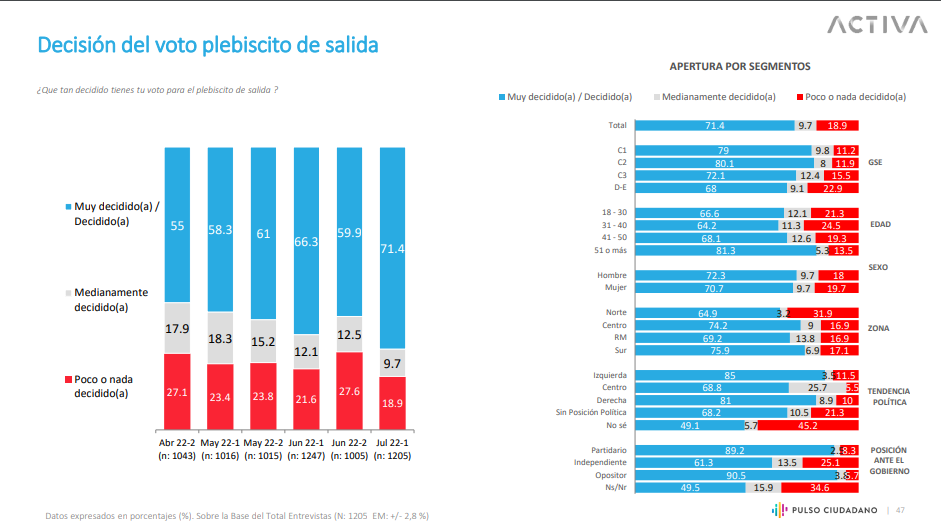 Un 71,4% de la población declara que tiene muy decidido/decidido su voto para el Plebiscito, mientras que un 18,9% está nada/poco decidido con su voto y un 9,7% esta medianamente decidido.