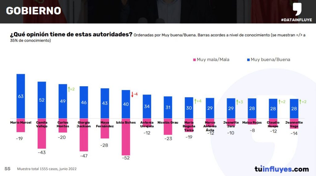 La única que baja es Izkia Siches, que obtiene un 40% (4 puntos menos) y que además tiene la mayor desaprobación con un 52%. También obtuvieron alta desaprobación Jackson (47%) y Vallejo (43%).
