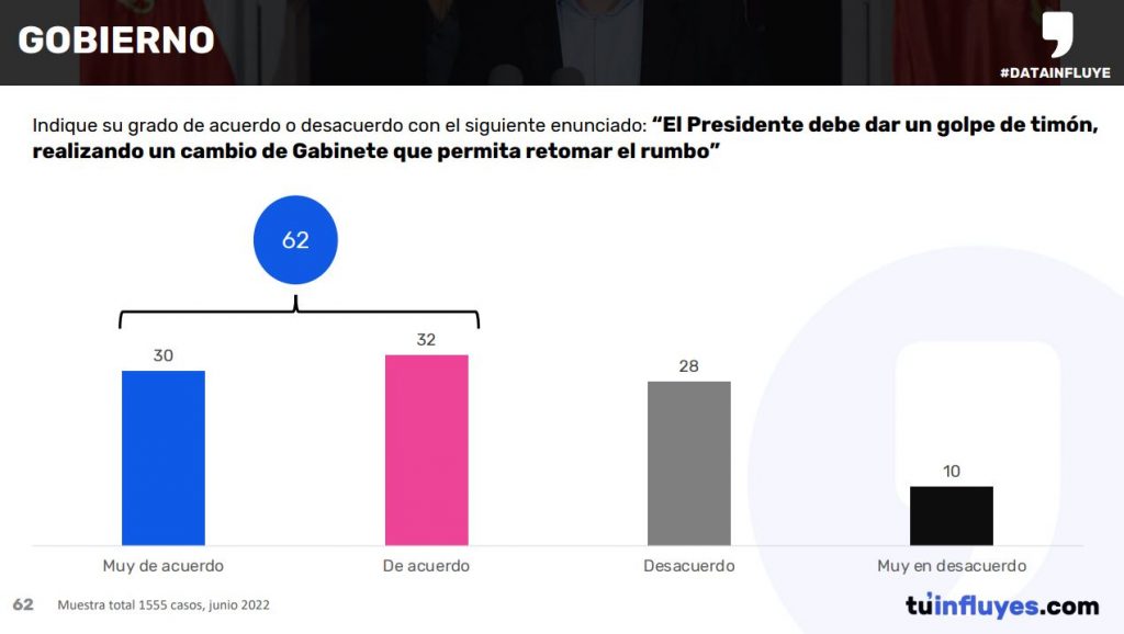 La encuesta Data Influye dio a conocer que, de acuerdo a su última medición, el 62% de los consultados dijo estar de acuerdo y muy de acuerdo con la opción de efectuar un cambio de Gabinete «que permita retomar el rumbo».