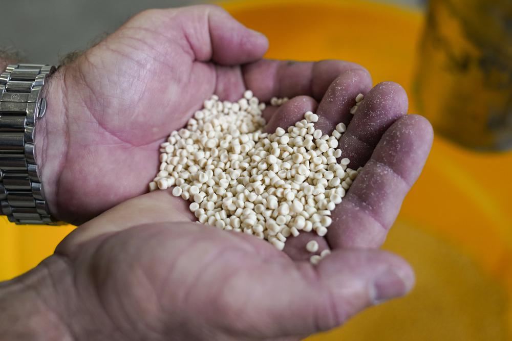 Kevin Welsh sostiene gránulos de PHA en la planta de Danimer Scientific el miércoles 3 de agosto de 2022 en Winchester, Ky. Las empresas están invirtiendo miles de millones de dólares para aumentar la producción de plásticos hechos de materiales naturales y renovables que se pueden compostar de manera segura o se pueden biodegradar en las condiciones adecuadas. Danimer Scientific es una de las empresas que apuesta fuerte por el bioplástico con la ampliación de una planta. (Foto AP/Jeff Dean)
