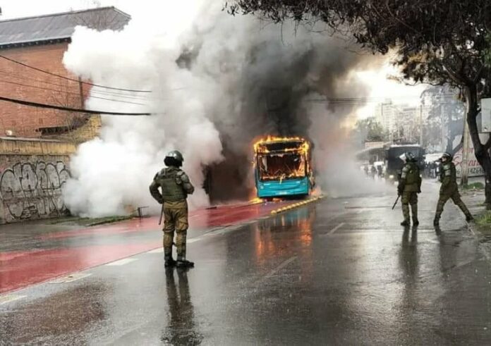 La quema de los microbuses ocurre en el marco de movilizaciones convocadas para esta jornada en distintos puntos de la capital y donde también se han registrado evasiones masivas en varias estaciones del Metro.