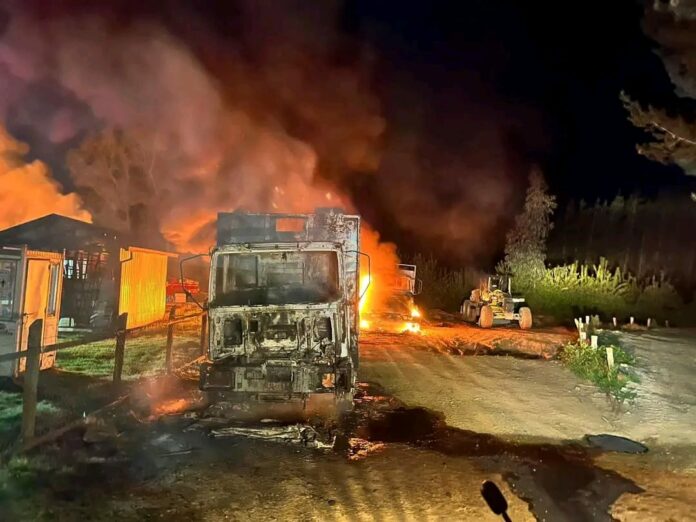 Tras el ataque reivindicatorio, quedaron cinco equipos forestales destruidos como camiones y maquinaria, además de 6 camionetas y un furgón, en el lugar habían más de 40 trabajadores, ninguno resulto herido, sostiene la CAM. «¡ A los enemigos del pueblo Mapuche, las forestales, no se les negocia, se les expulsa !«, señala la nota.