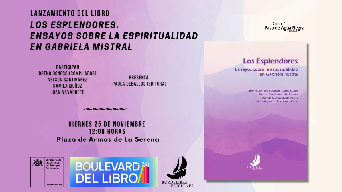 “Los Esplendores. Ensayos sobre la espiritualidad en Gabriela Mistral” tendrá su lanzamiento en El Boulevard del Libro que se realizará en la Plaza de la Armas de La Serena el día 25 de noviembre, a las 12:00 PM (mediodía) y será presentado por Donoso quien en dicha oportunidad contará con la presencia de los demás investigadores.