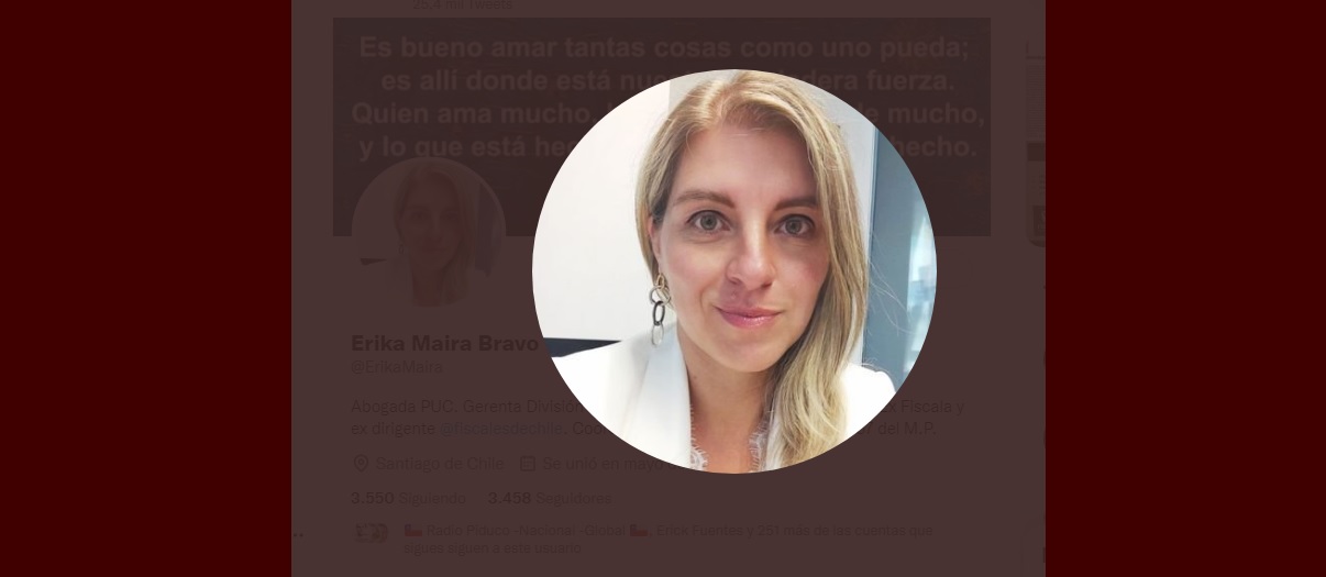 Erika Maria, en twitter cuenta con 3.458 seguidores, es abogada de la UC, ingresó a la Fiscalía en 2006 y entre los abogados se comenta que es cercana al abogado Pedro Orthusteguy, quien participo en la puesta en marcha la Reforma Procesal Penal. También La Tercera -el diario favorito de los gobiernos de turno apra hacer toda clase de «trascendidos»- le sacó los «trapitos al sol» y relató que uno de los problemas que enfrentó Maira antes de la votación de la segunda quina de la Suprema apuntó a que en octubre de 2019 fue sancionada por haber infringido la obligación de “obedecer las órdenes impartidas por su superior jerárquico”. el episodio ocurrió cuando dejó la fiscalía adjunta en la Fiscalía Metropolitana Sur, donde lideraba muchas causas por violencia intrafamiliar, y no hizo un informe sobre su estado. Maira se defendió, señalando que siempre quiso elaborar este documento, pero que no tenía un equipo que la apoyara en esa labor y que tenía alrededor de 850 causas a su cargo.
