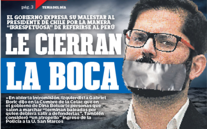 Tanto así, que el diario peruano, El Correo publicó una polémica portada este jueves, atacando directamente al mandatario chileno: aparece el Presidente Boric con una cinta en su boca junto al titular «le cierran la boca», aludiendo a la reacción del Gobierno peruano por las declaraciones del jefe de Estado chileno.