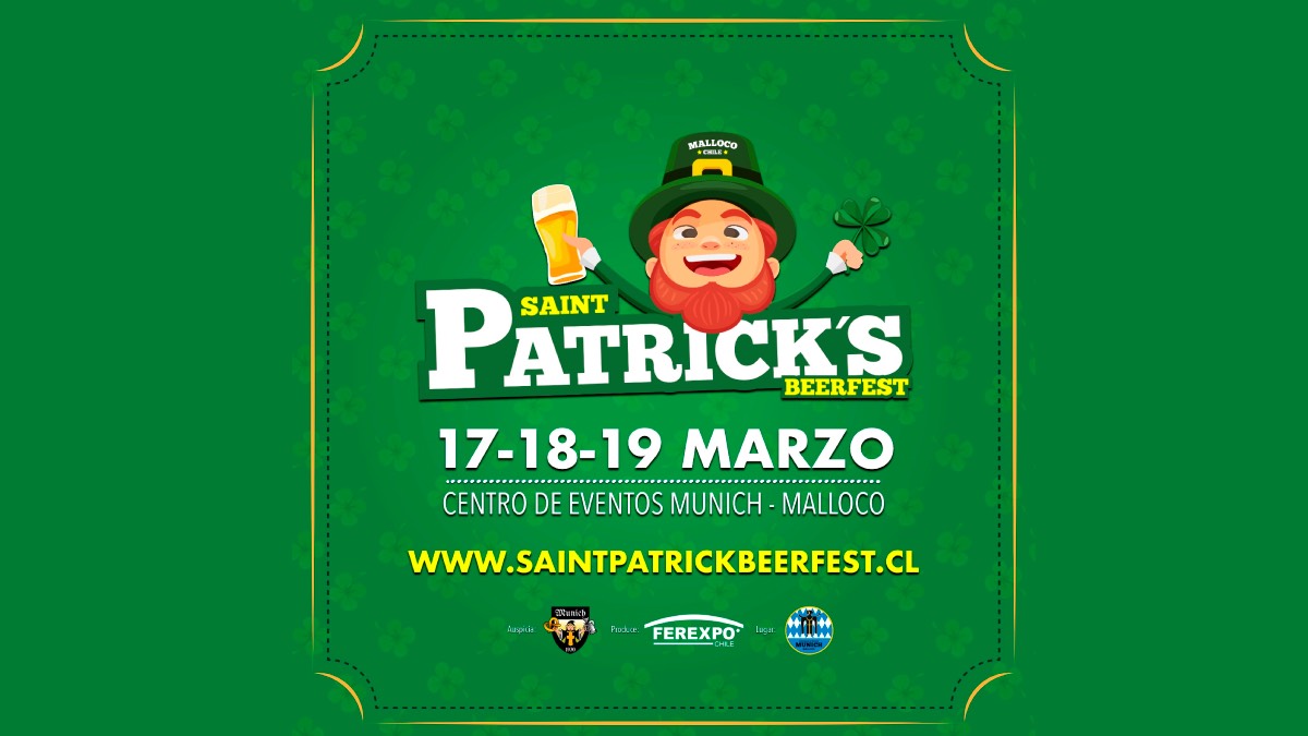 “Saint Patrick’s BeerFest” se llevará a cabo del 17 al 19 de marzo, desde las 12:30 horas, en Av. Balmaceda 2933, Malloco, comuna de Peñaflor. Entradas disponibles en PuntoTicket, en su primera preventa desde los $4.000 más cargo por servicio hasta el 1 de marzo, mientras que el valor por el abono por los tres días es de $10.000 más cargo por servicio. Menores hasta los 13 años entran gratis acompañados de un adulto.