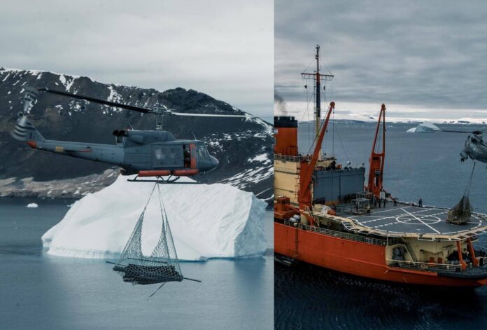 Durante dos jornadas, domingo y lunes, a bordo del Rompehielos ARA “Almirante Irízar” se trabajó en la logística, para el traslado a bordo de los helicópteros Sea King, de las estructuras y todos los elementos necesarios para la instalación de dos refugios al noreste de la península antártica, uno destinado a isla Vega y el otro a la isla Cerro Nevado, ambos próximos a la Base Antártica Conjunta Marambio.