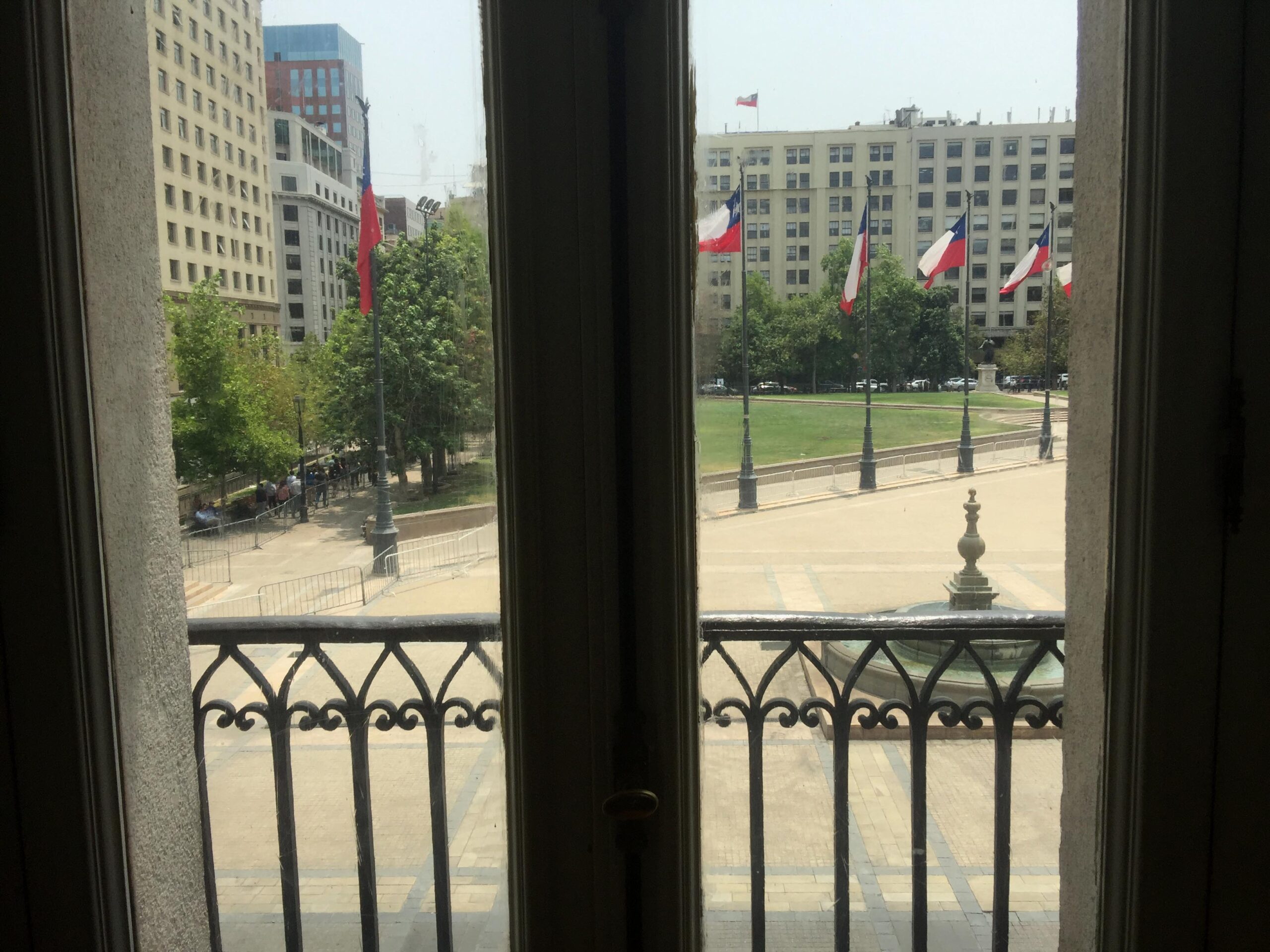 Vista a la Plaza de la Constitución desde el Salón independencia, segundo piso de La Moneda. (Foto: Infogate tomada el 16 de enero de 2020 a las 13:21 hrs.)