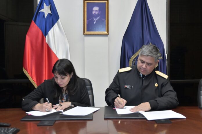 La firma del convenio fue encabezada por el Director de Directemar, vicealmirante Fernando Cabrera, y la Directora Nacional de Aduanas, Alejandra Arriaza, quienes destacaron su alcance y el trabajo colaborativo que ambos organismos vienen desarrollando desde hace un tiempo en el ámbito marítimo.
