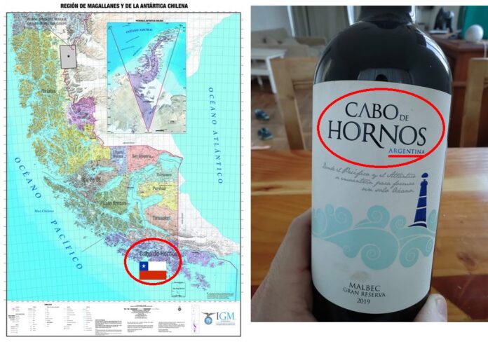 Mapa oficial de Chile con ubicación del Cabo de Hornos y el vino argentino con la etiqueta "mañosa"
