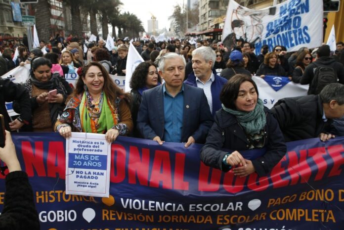 SANTIAGO (AP) — Unos 10.000 profesores de escuelas públicas marcharon el miércoles para presionar por el pago de una deuda histórica que cifran en unos 17.000 millones de dólares, de bonificaciones para jubilar y por mejoras en el entorno escolar.
