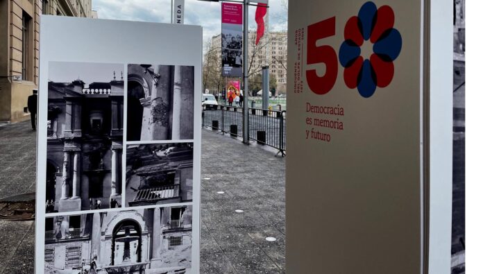 Exposición del MOP en calle Morandé que muestra La Moneda tras el bombardeo del 11 de septiembre de 1973. (Foto: Infogate)