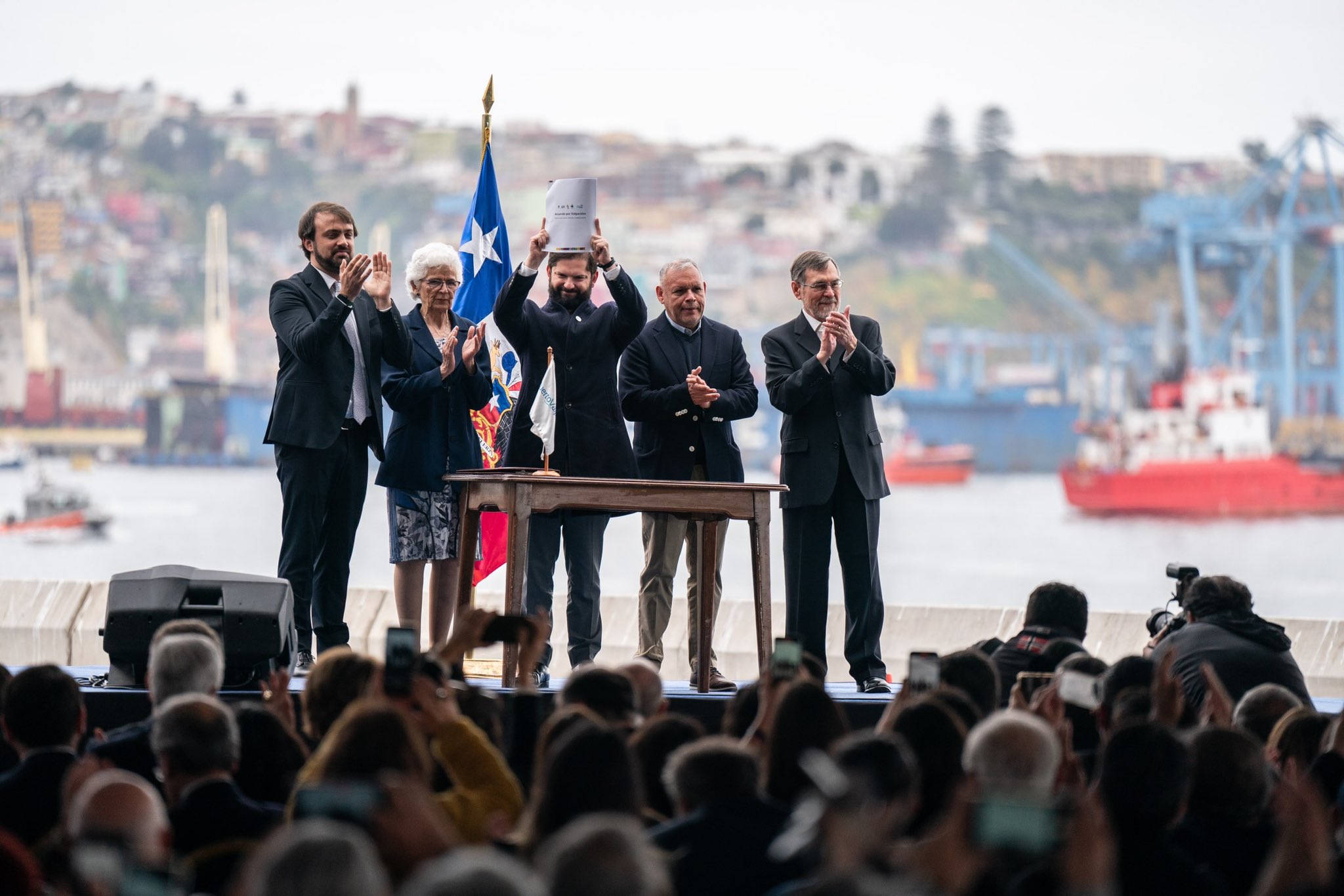 Este lunes, el Presidente de la República, Gabriel Boric, encabezó la ceremonia de firma del “Acuerdo Portuario por Valparaíso” en el Terminal Portuario porteño.