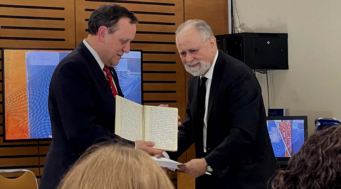 Rector de la UC, Ignacio Sánchez, muestra uno de los cuadernos manuscritos de Coloane, a su lado el hijo del escritor Juan Francisco Coloane haciendo entrega de los manuscritos. (Foto: Infogate)