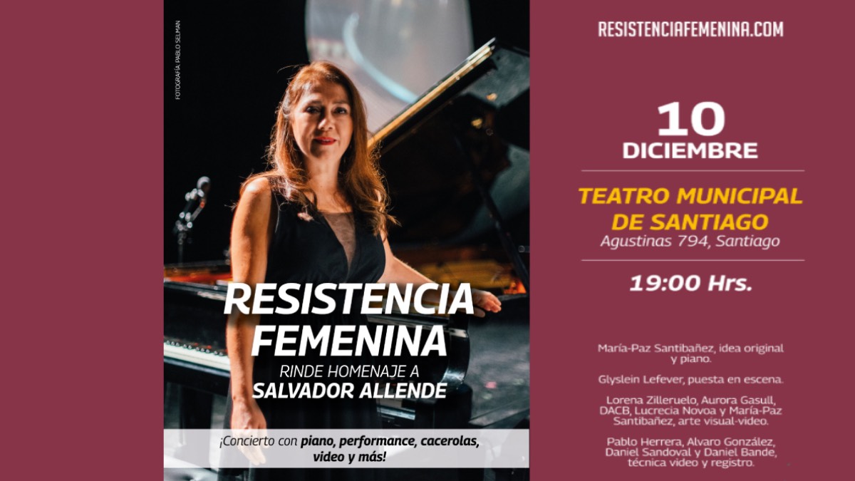 Concierto de piano, video, poesía, performance e incluso cacerolas, forman parte del espectáculo multidisciplinario “Resistencia Femenina”, de la pianista chilena María Paz Santibáñez, que este domingo 10 de diciembre se presenta en el Teatro Municipal de Santiago, como cierre de las actividades conmemorativas de los 50 años del Golpe de Estado realizadas por la Universidad Tecnológica Metropolitana, UTEM.