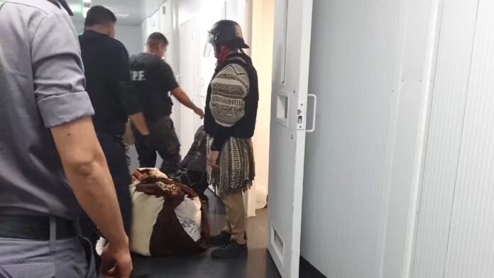 Con chaleco antibalas y casco, Jones Huala abordó uno de los furgones para traslado de detenidos y a su lado los agentes ubicaron sus pertenencias personales, entre las que había prendas de vestir, libros, cuadernos con anotaciones y algunas banderas, acotó el medio.