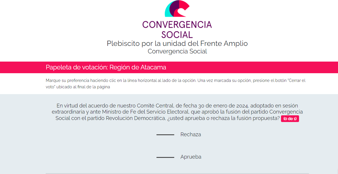 En ese sentido, al ingresar a la página web de Convergencia Social, aparece el banner para enviarlo a la página de votación, pero es aquí donde surge el problema, ya que entrando por Revolución Democrática, hay que iniciar sesión como militante del partido por lo que se impide que cualquier votante sufrague.