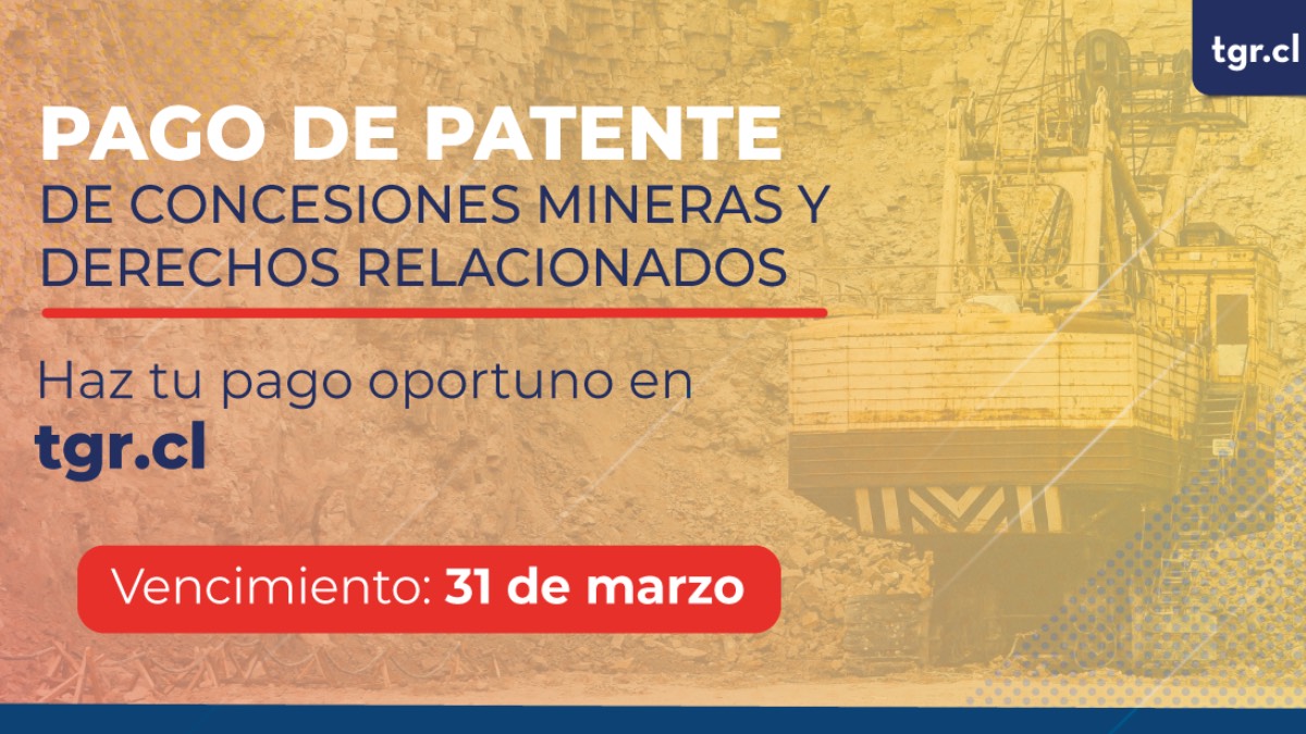 Con el fin de simplificar el proceso para las y los contribuyentes, Tesorería General de la República (TGR) ha anunciado la disponibilidad de su plataforma digital tgr.cl para la realización del pago anual de patentes mineras y patentes por no aprovechamiento de derechos de aguas, según corresponda. La fecha límite para cumplir con estas obligaciones fiscales es el 31 de marzo de 2024.