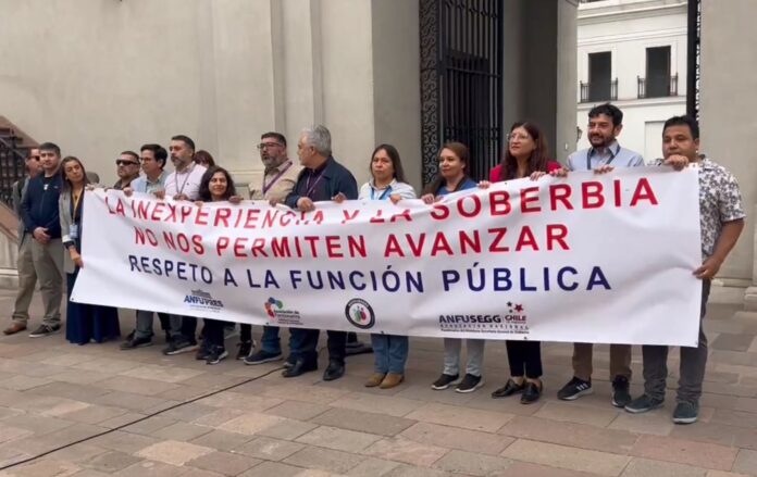 Los trabajadores de la Asociación de Funcionarios de La Moneda, acompañados por el presidente de la CUT, David Acuña, desplegaron en el Patio de Los Naranjos un lienzo con la frase «la inexperiencia y la soberbia no nos permiten avanzar, respeto a la función pública».