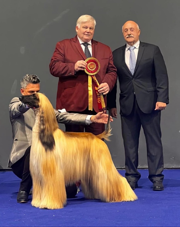 Lebrel Afgano de 5 años criada en Chile por Ramón Podestá, que acaba de convertirse en el primer perro chileno en obtener los 3 premios más importantes del World Dog Show 2024 realizado en la ciudad de Zagreb, Croacia, evento canino internacional considerado como el más importante del mundo desde su creación, en 1971.