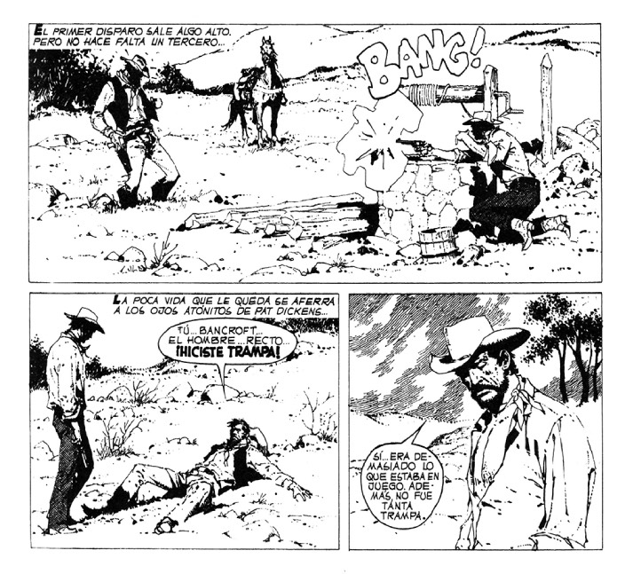 “Las balas están ahí mismo, en el cajón… pero Walt Simpson no tiene ninguna gana de encontrarlas. Los bandidos se atrapan entre muchos, o cuando están descuidados, nunca cuando pueden tirar. Se explica: Walt Simpson, Sheriff de Sicomoro, tiene mujer y tres hijos. Y una muchacha mestiza con todo el nervio de una potranca joven… quizás esta misma noche cuando todos duerman pueda visitarla”.
