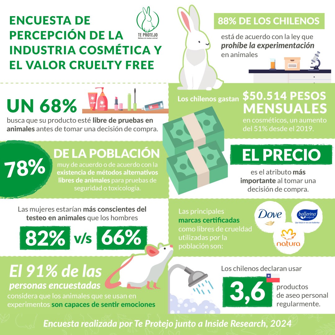 - Una encuesta de ONG Te Protejo junto a Inside Research evaluó la percepción de la industria cosmética en el país y su perspectiva sobre el fin de las pruebas en animales para esta industria, destacando además un aumento del 50% en el presupuesto mensual dedicado a estos productos.