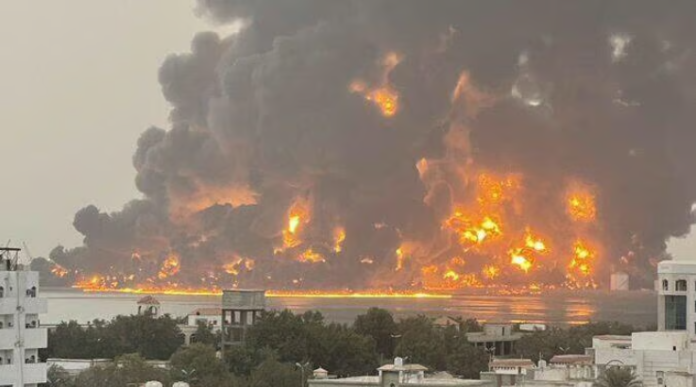 Ciudad y puerto de Hodeida, Yemen en llamas luego del bombardeo israelí con F-15.