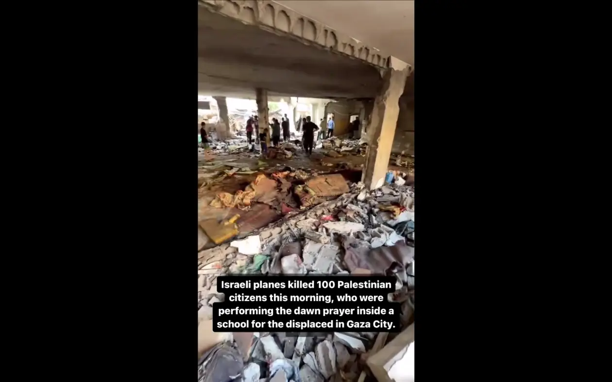 The aftermath of the Israeli occupation’s bombardment of Al-Tabi'in School in Gaza City this morning, where at least a hundred Palestinians were slaughtered while they were praying. pic.twitter.com/G8FYx12Qnz