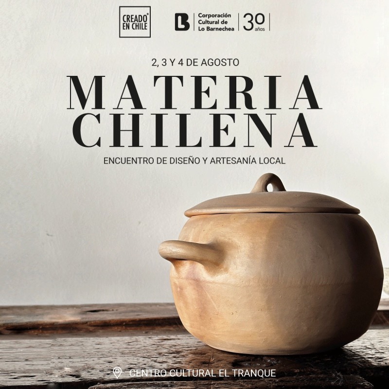 Con el propósito de promover el talento local y dar a conocer al público piezas de artesanía únicas, la Corporación Cultural de Lo Barnechea y Creado en Chile realizarán MATERIA CHILENA, el primer encuentro de artesanía local, un evento que reunirá a más de 30 creadores y emprendedores que desarrollan y/o comercializan sus creaciones en torno a la madera, piedra, fibra, cuero, metal, crin, lana, arcilla y más.