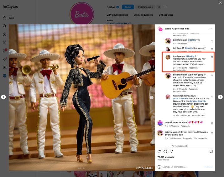 Sin embargo, algunos usuarios en redes sociales se preguntaron: ¿Por qué una Barbie y no un Ken? y que su parecido era más a Selena que a Juan Gabriel. Desde Mattel, no ha habido respuesta pero sí sabemos que los mexicanos están orgullosos de contar con una Barbie que represente al gran «Juanga».