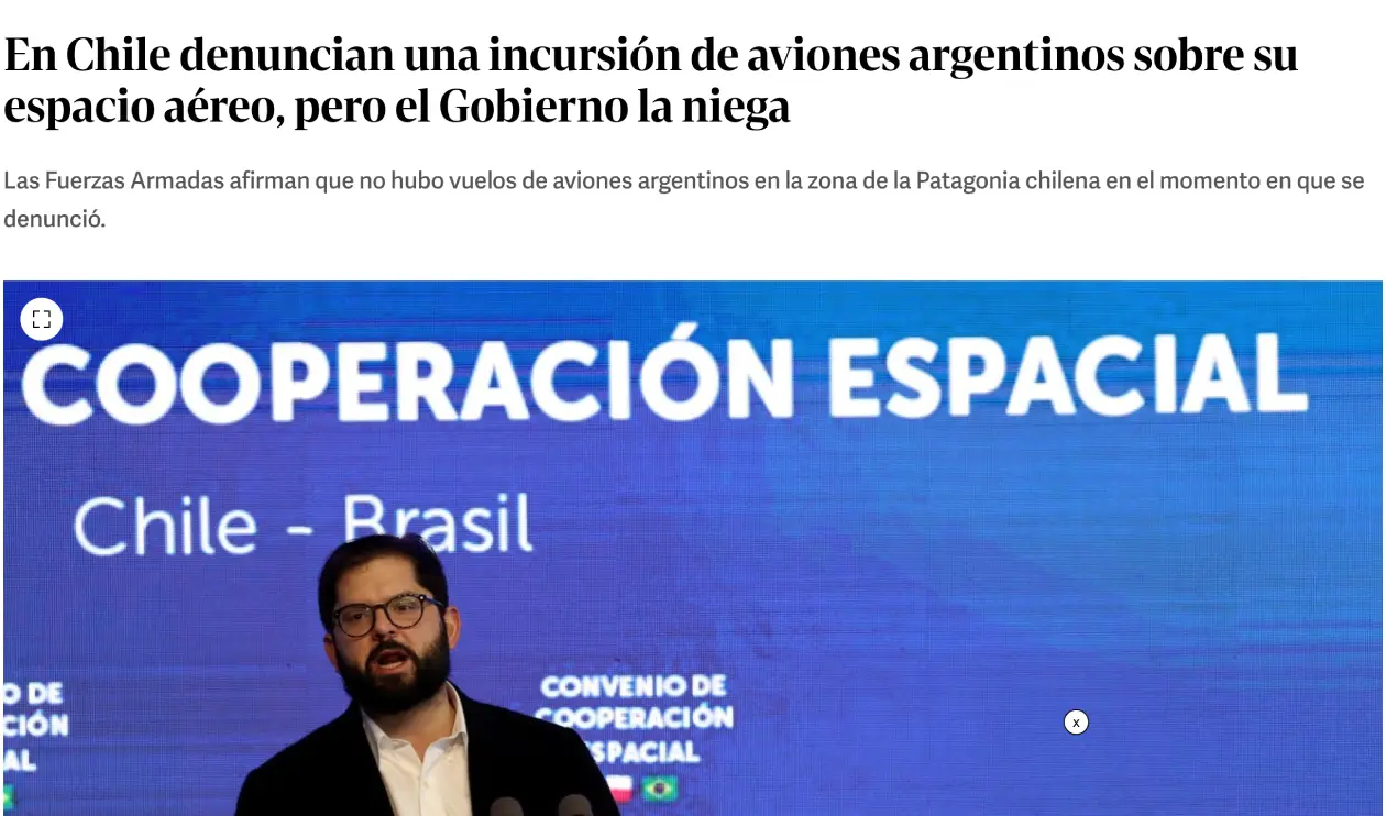 Clarín reseña: «En Chile denuncian una incursión de aviones argentinos sobre su espacio aéreo, pero el Gobierno la niega. Las Fuerzas Armadas afirman que no hubo vuelos de aviones argentinos en la zona de la Patagonia chilena en el momento en que se denunció. La insólita reacción originada en el gobierno de Gabriel Boric por la denuncia de un tuitero chileno que contó que aviones de las fuerzas armadas de su país despegaron ante una «alerta» por una supuesta «violación» del espacio aéreo trasandino por parte de aeronaves argentinas refleja una vez más la sensibilidad bilateral con asuntos territoriales, militares y diplomáticos».