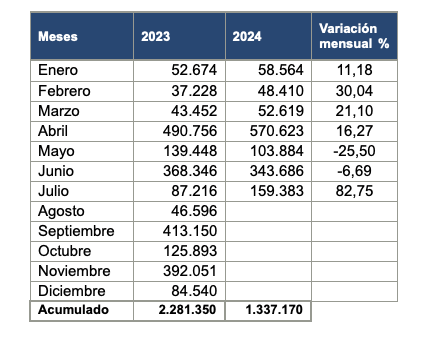 En los meses de mayo y junio de 2024 se registraron bajas en la recaudación por contribuciones, en comparación con los mismos meses de 2023, de -25,5% y -6,69%, respectivamente. No obstante, las notorias alzas registradas en el periodo enero-abril de 2024, más el gran aumento observado en julio de 2024 (82,75%) explican el alza de 9,68%, en los siete primeros meses del presente año.